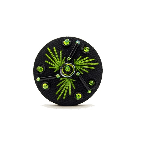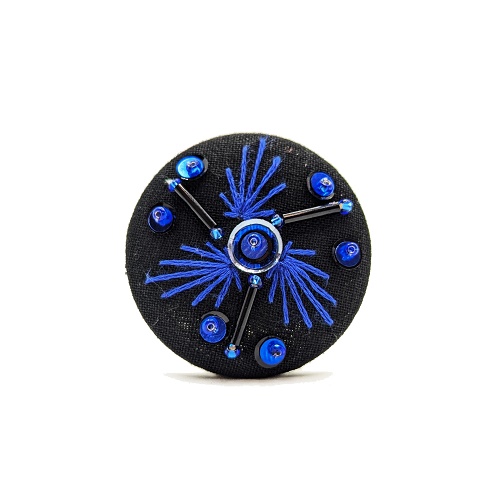 Ce motif est entièrement brodé à la main sur un tissu noir d’une forme géométrique, il est réalisé avec du fil de coton, des tubes et perles de verre.
