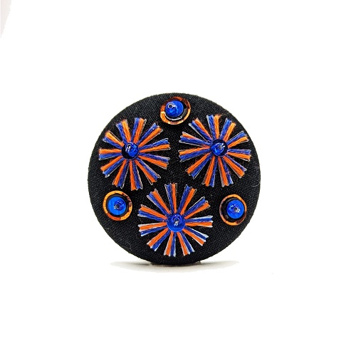 Ce motif est entièrement brodé à la main sur un tissu noir d’une forme géométrique, il est réalisé avec du fil de coton, des tubes et perles de verre.
