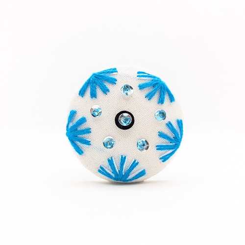 Cette broche est composée de 2 aimants, le premier se trouve à l’intérieur de la broche et le second, recouvert de PVC, se positionne au dos du vêtement (ils sont d’une puissance suffisante pour tenir sur une veste en cuir ou en jean, ou même un manteau).