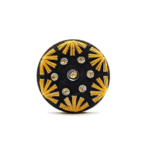 Ce motif est entièrement brodé à la main sur un tissu noir d’une forme géométrique, il est réalisé avec du fil de coton, et perles de verre.