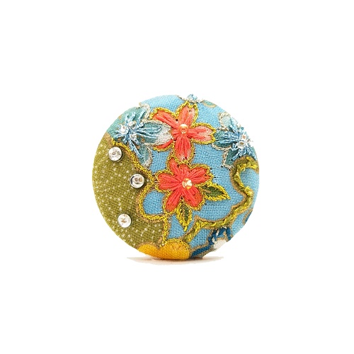 Ce motif est entièrement brodé à la main sur un tissu imprimé japonais en peinture à l’aiguille pour le garnissage des fleurs, en broderie de Beauvais (chainette au fil d’or).